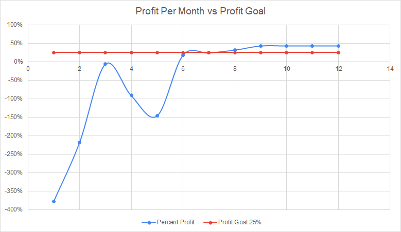 Now the first thing we have to clarify is what are we seeing as meeting expectations? Well, to put it simply, the expectation is the product is generating a 25% margin meaning that the profit that is generated by this product is about 25% of the revenue. Now if we were to look at the year end average for this product, the product margin is about 4%, but does this really mean that the product is not meeting expectations? Remember, this is the first year of the product being released, and there is always a chance that a new product may have a rocky start. To see how the product did per month compared to the product expectation of 25%, and from what I can see the product was very far from meeting the expectation; however, around the seventh month the product was then going beyond the product’s expectation.