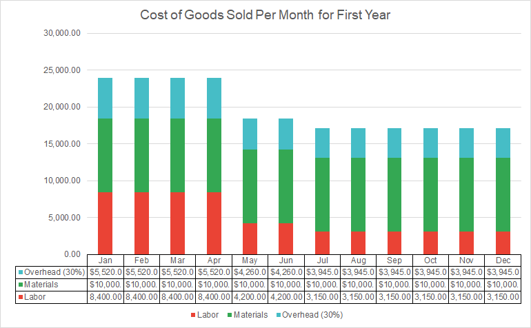 So the next question is what caused the this product to go from not meeting their to goal to exceeding their goal? If we look at the same time line, we can see that revenue began to sharply jump after May and then hit three consecutive months in the last quarter of $30K in revenue sales. We also see that around April, the cost of good sold began to drop and flatten at around $17K. The three major components for cost of goods sold is labor, materials, and overhead which is set at 30% of the labor and material costs. What we see when we break down the costs is that labor drop significantly and with it our overhead costs as well resulting in a cheaper cost per unit.
